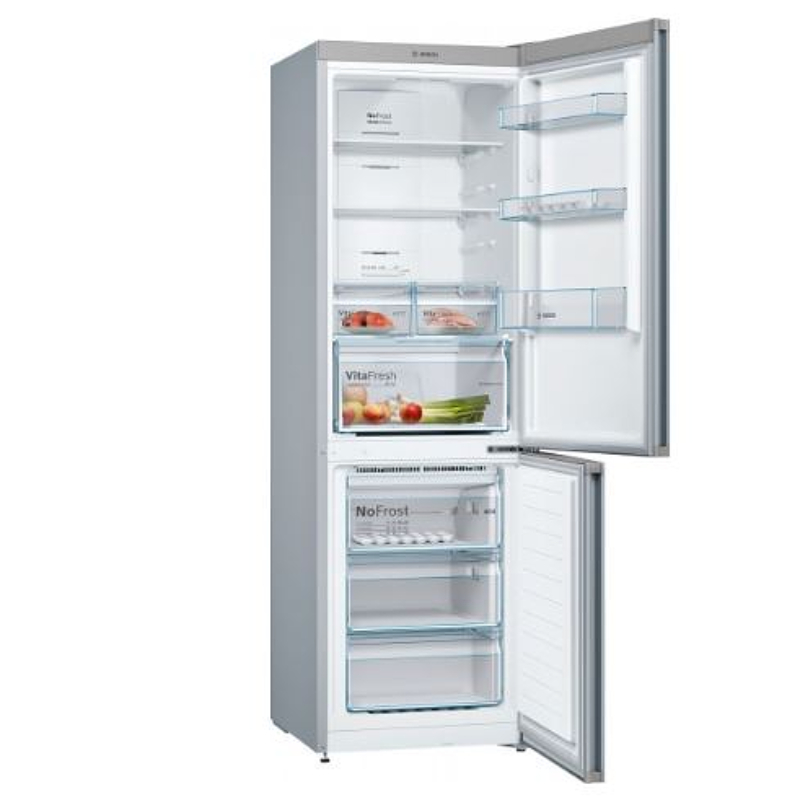 Bosch soyuducusu müasir texnologiyaları və funksional dizaynı ilə seçilir. Ümumi həcmi 324 litrdir; bunun 237 litri soyuducu, 87 litri isə dondurucu bölməyə aiddir. NoFrost texnologiyası sayəsində buzlanmanın qarşısı alınır və əl ilə buz əridilməsinə ehtiyac qalmır. VitaFresh sistemi meyvə, tərəvəz, ət və balıq məhsullarını daha uzun müddət təravətli saxlayır. LED işıqlandırma daxili məkanı bərabər və parıltısız şəkildə işıqlandırır. EasyAccess rəfləri sayəsində məhsullara rahatlıqla çatmaq mümkündür. Enerji sərfiyyatı A++ sinfinə aiddir və illik təxminən 237 kVt·saat təşkil edir. Səs səviyyəsi 39 dB-dir, bu da səssiz işləməyi təmin edir.