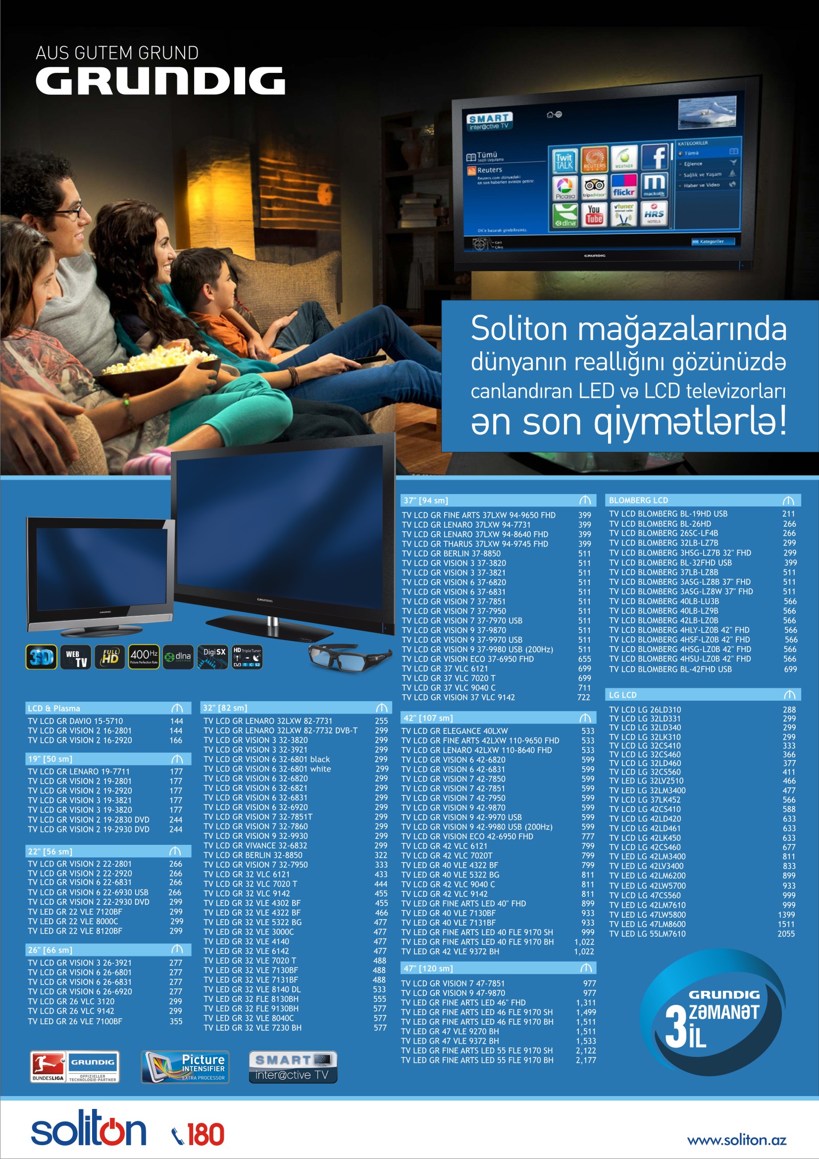 Soliton mağazalarında GRUNDIG, BLOMBERG, LG markalı LCD və LED televizorlarını ən son qiymətlərlə əldə edin.