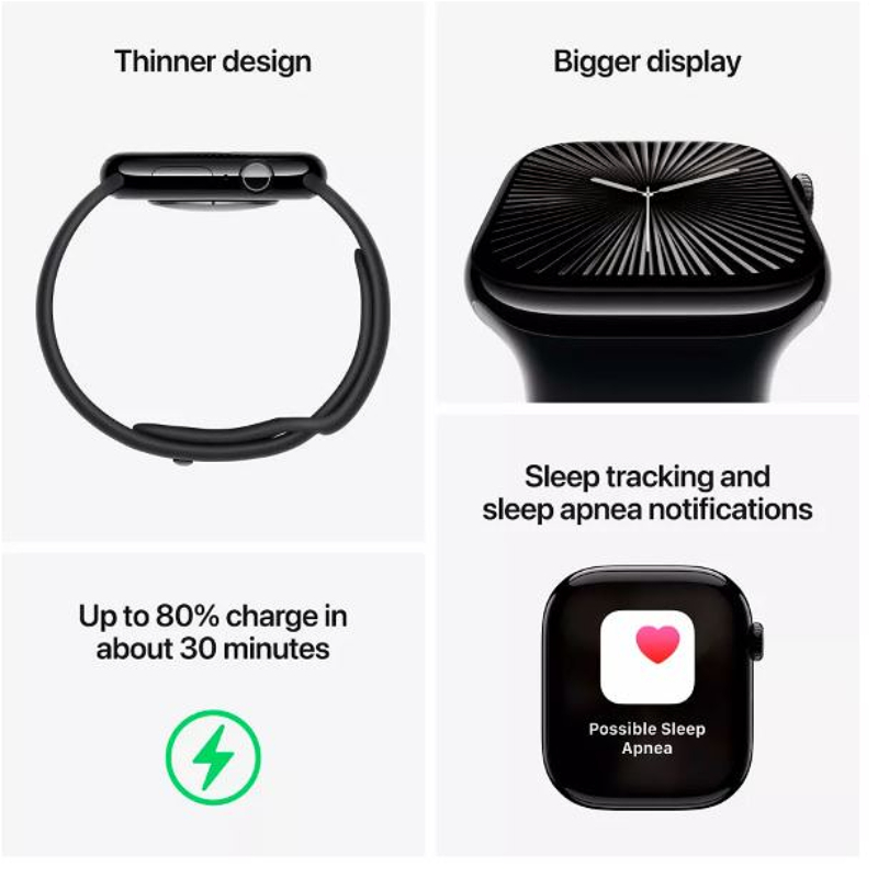 Məhsulun kodu: MAA53Növü: Smart saatƏməliyyat sistemi: WatchOS 11Əməliyyat sisteminin uyğunluğu: iOSEkranın növü: LTPO3 OLEDGörüntü imkanı: 416 × 496Korpusun materialı: AlüminiumKəmərin materialı: Silikon (çıxarılan)İşləmə müddəti: 36 saatadəkEnerji toplama müddəti: 1.5 saatadəkProsessor: Apple S10 SiPDaxili yaddaş: 64 GBBluetooth versiyası: 5.3Wi-Fi: varNaviqasiya: GPSRəngi / Ölçüsü: Silver 46 mmÇəki: 36.5 qMikrofon: varAddımölçən: varÜrək döyüntüsü sensoru: varKalori hesablayıcı: varEkran ölçüsü: 1.96Yuxu monitorinqi: varSudan və tozdan qorunma: iP6XSimsiz şarj: varGiroskop: varQanda oksigen səviyyəsinin göstəricisi: varTəmassız ödənişlər: var