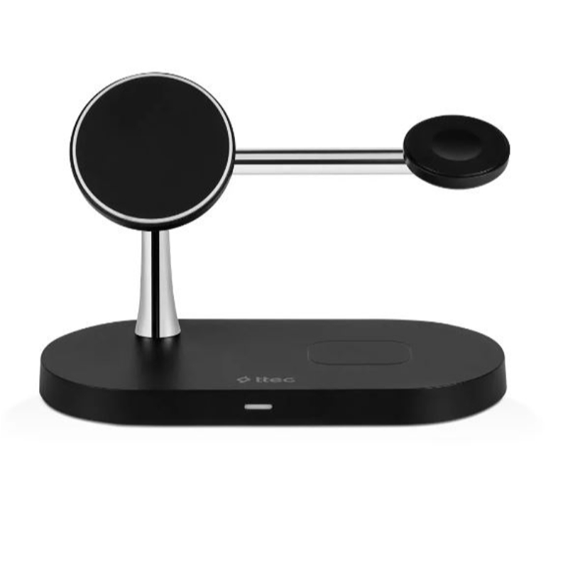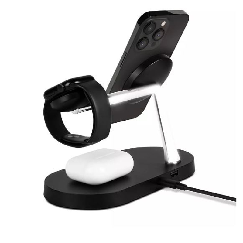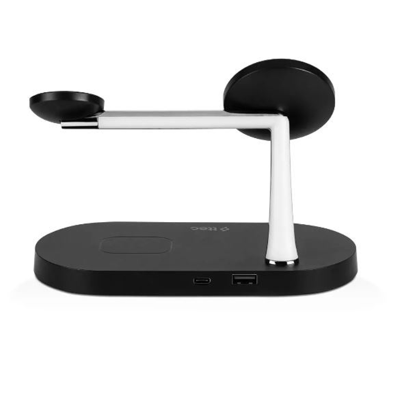 Məhsulun kodu: MAT03Növü: Wireless charger / Phone holder Uyğunluq: Eyni zamanda simsiz sürətli şarj üçün iPhone, Apple Watch və AirPodsÜstünlüklər: 7.5W iPhone + 2W AirPods + 3W Apple Watch + 10W USB-A, 3 səviyyəli, parlaqlığı tənzimlənən sensorlu LED gecə işığıRəngi / Ölçüsü: Qara