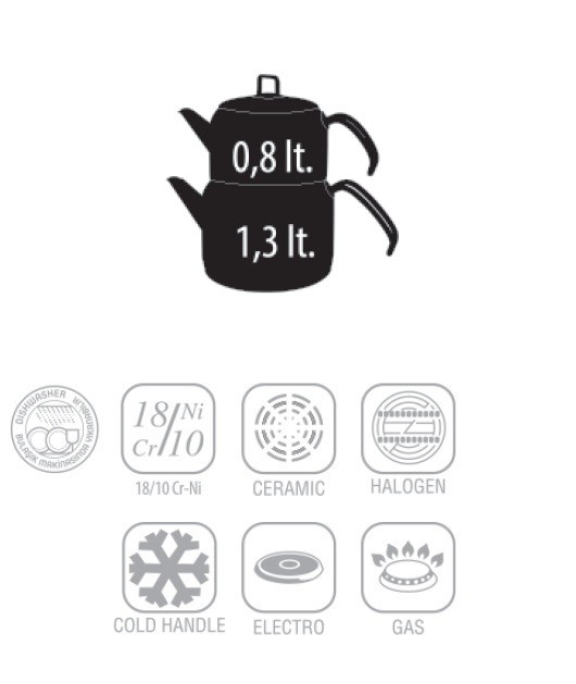 Əsas xüsusiyyətləri: Üst çaynik 0.8 lt, Alt çaydan 1.3 lt