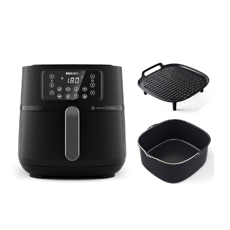 Philips Airfryer 7.2 litrlik geniş tutumu ilə böyük ailələr üçün ideal seçimdir. Bu hava fritozu 2000 Vt gücündədir və Rapid Air texnologiyası sayəsində yeməkləri 90%-ə qədər az yağla bişirərək xırtıldayan və ləzzətli nəticələr əldə etməyə imkan verir. 16 müxtəlif bişirmə funksiyası o cümlədən qızartma, bişirmə, qril, soba, fermentasiya və yenidən qızdırma rejimləri ilə çox yönlü istifadəyə malikdir. Wi-Fi bağlantısı və Philips HomeID tətbiqi vasitəsilə cihazı uzaqdan idarə etmək və yüzlərlə reseptə çıxış əldə etmək mümkündür. Smart Sensing texnologiyası yeməyin növünə və miqdarına əsasən bişirmə vaxtını və temperaturunu avtomatik tənzimləyir. İstifadəçi dostu sensorlu ekran və əvvəlcədən təyin edilmiş proqramlar ilə idarəetmə asandır. Sökülə bilən hissələr və yapışmayan örtüklü səbət qabyuyan maşında yuyula bilər, bu da təmizliyi sadələşdirir. Philips Airfryer sağlam və sürətli yemək hazırlamaq istəyənlər üçün müasir və funksional bir mətbəx cihazıdır.