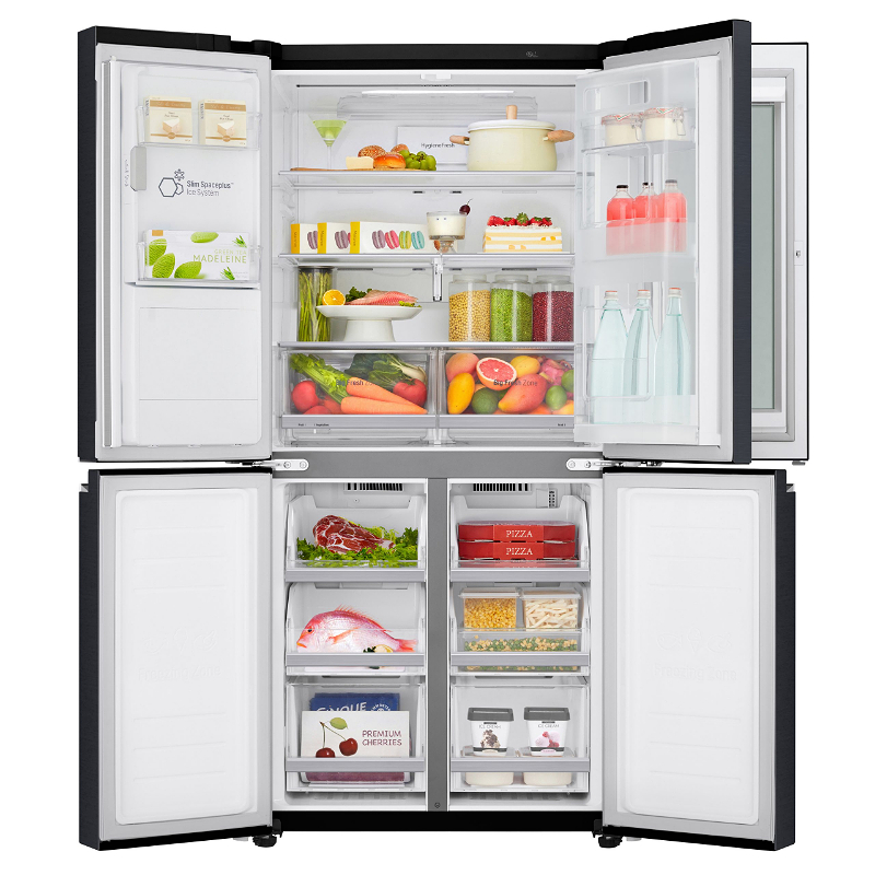 Bu soyuducu 570 litrlik ümumi tutumu ilə geniş ailələr üçün ideal seçimdir. Soyuducu bölməsi 423 litr, dondurucu isə 147 litr həcmlə məhsulları rahatlıqla yerləşdirməyə imkan verir. Multi Air Flow sistemi hər bölmədə bərabər hava dövranı təmin edir. İnverter Linear Kompressor həm səssiz, həm də enerjiyə qənaətcil işləyir. Səs səviyyəsi cəmi 38 dB-dir, bu isə evdə sakitliyi qoruyur. InstaView Door-in-Door texnologiyası ilə qapıya iki dəfə vuraraq içərini görmək mümkündür, bu da tez-tez istifadə olunan məhsullara rahat çıxış imkanı yaradır. Hygiene Fresh+ sistemi hava təmizliyini qoruyur və qoxuların yayılmasının qarşısını alır. DoorCooling+ texnologiyası isə soyuducunun hər nöqtəsində eyni temperaturu təmin edir. SpacePlus Ice System buz hazırlayıcısı qapıya yerləşdirildiyindən içəridə daha çox yer qalır. LG ThinQ tətbiqi ilə soyuducunu mobil telefon vasitəsilə idarə edə bilərsən. Mat qara rəngli korpusu və dörd qapılı dizaynı ilə mətbəxə zərif və müasir görüntü verir. Daxili LED işıqlandırma məhsulların rahat görünməsini təmin edir. Bu model həm funksionallıq, həm texnologiya, həm də estetik baxımdan gözləntiləri qarşılayır.
